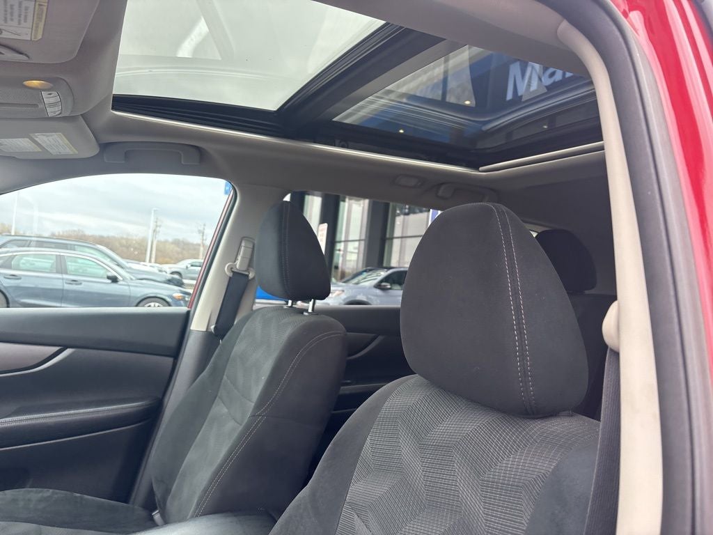 This vehicle Contains the following features and options: SV Moonroof Package (Power Panoramic Moonroof), SV Premium Package (AroundView Monitor, Blind Spot Warning, Heated Outside Mirrors, Heated Seats, Power Liftgate, and Radio: AM/FM/CD/RDS/AUX NissanConnect w/Navigation), 17 Aluminum Alloy Wheels, 4-Wheel Disc Brakes, 5.694 Axle Ratio, 6 Speakers, ABS brakes, Activation Disclaimer, Air Conditioning, Alloy wheels, AM/FM radio: SiriusXM, Anti-whiplash front head restraints, Automatic temperature control, Brake assist, Bumpers: body-color, CD player, Cloth Seat Trim, Delay-off headlights, Driver door bin, Driver vanity mirror, Dual front impact airbags, Dual front side impact airbags, Electronic Stability Control, Floor Mats & 2-PC Cargo Area Protector, Four wheel independent suspension, Front anti-roll bar, Front Bucket Seats, Front Center Armrest w/Storage, Front dual zone A/C, Front reading lights, Fully automatic headlights, Illuminated entry, Low tire pressure warning, Occupant sensing airbag, Outside temperature display, Overhead airbag, Overhead console, Panic alarm, Passenger door bin, Passenger vanity mirror, Power door mirrors, Power driver seat, Power steering, Power windows, Radio data system, Radio: AM/FM/CD/RDS/AUX NissanConnect, Rear anti-roll bar, Rear seat center armrest, Rear window defroster, Rear window wiper, Remote keyless entry, Roof rack: rails only, Security system, Speed control, Speed-sensing steering, Splash Guards, Split folding rear seat, Spoiler, Steering wheel mounted audio controls, Tachometer, Telescoping steering wheel, Tilt steering wheel, Traction control, Trip computer, Turn signal indicator mirrors, and Variably intermittent wipers.