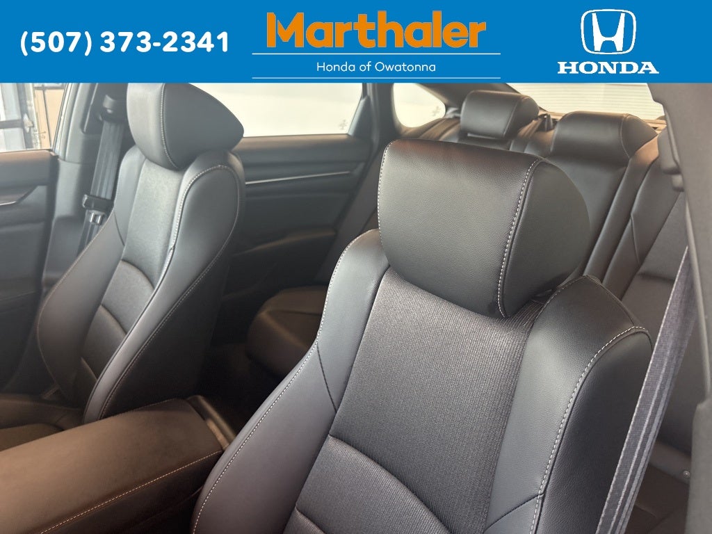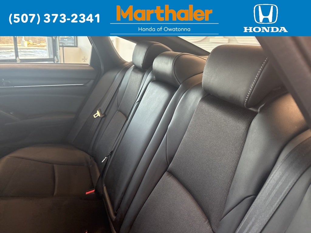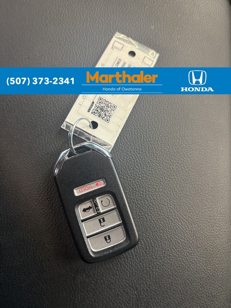 This vehicle Contains the following features and options: 4-Wheel Disc Brakes, 8 Speakers, ABS brakes, Adaptive Cruise Control: Adaptive Cruise Control (ACC) with Low-Speed Follow, Air Conditioning, Alloy wheels, AM/FM radio: SiriusXM, Apple CarPlay/Android Auto, Auto High-beam Headlights, Automatic temperature control, Brake assist, Bumpers: body-color, Delay-off headlights, Driver door bin, Driver vanity mirror, Dual front impact airbags, Dual front side impact airbags, Electronic Stability Control, Emergency communication system: HondaLink, Exterior Parking Camera Rear, Fabric w/Synthetic Leather Seat Trim, Forward collision: Collision Mitigation Braking System (CMBS) + FCW mitigation, Four wheel independent suspension, Front anti-roll bar, Front Bucket Seats, Front Center Armrest, Front dual zone A/C, Front fog lights, Front reading lights, Fully automatic headlights, Heated door mirrors, Heated front seats, Illuminated entry, Knee airbag, Lane Departure Warning System, Leather steering wheel, Low tire pressure warning, Occupant sensing airbag, Outside temperature display, Overhead airbag, Overhead console, Panic alarm, Passenger door bin, Passenger vanity mirror, Power door mirrors, Power driver seat, Power steering, Power windows, Radio data system, Radio: 180-Watt HD Audio System, Rear anti-roll bar, Rear seat center armrest, Rear window defroster, Remote keyless entry, Security system, Speed control, Speed-sensing steering, Speed-Sensitive Wipers, Split folding rear seat, Steering wheel mounted audio controls, Telescoping steering wheel, Tilt steering wheel, Traction control, Trip computer, Variably intermittent wipers, and Wheels: 19 Machine-Finished Alloy w/Black Inserts.