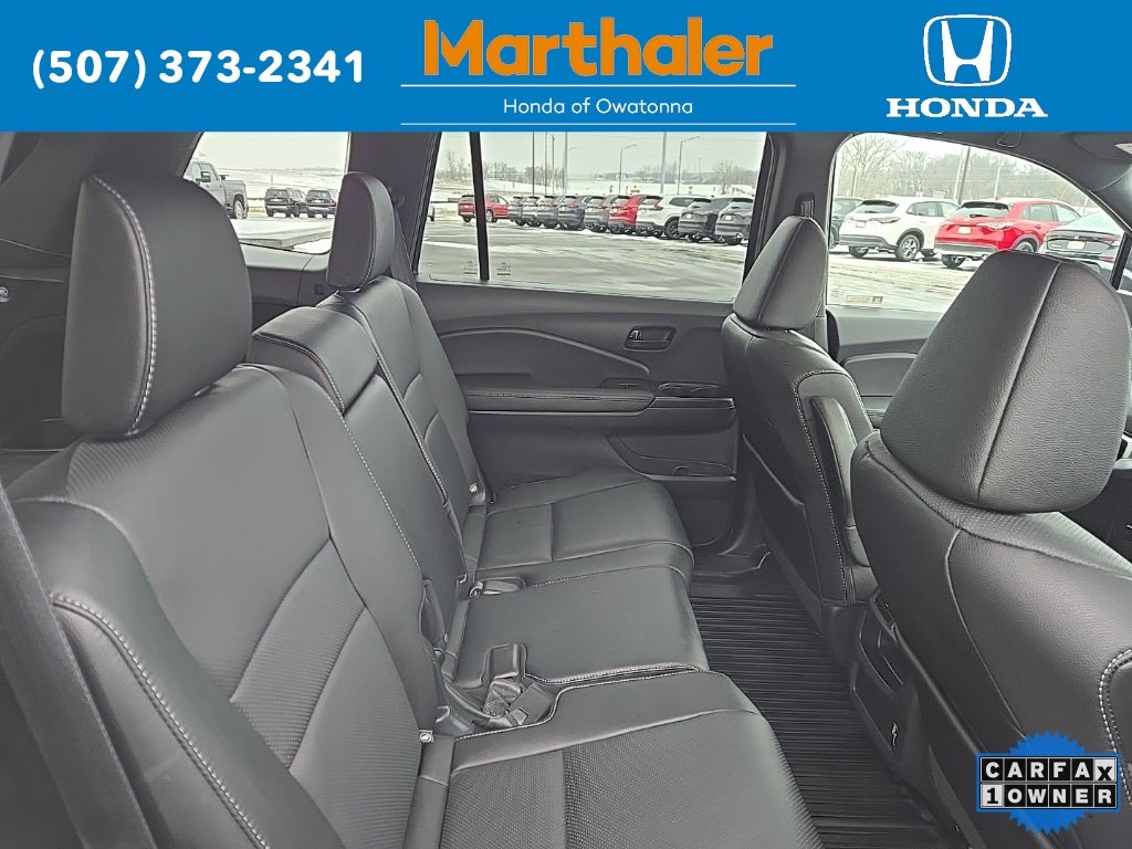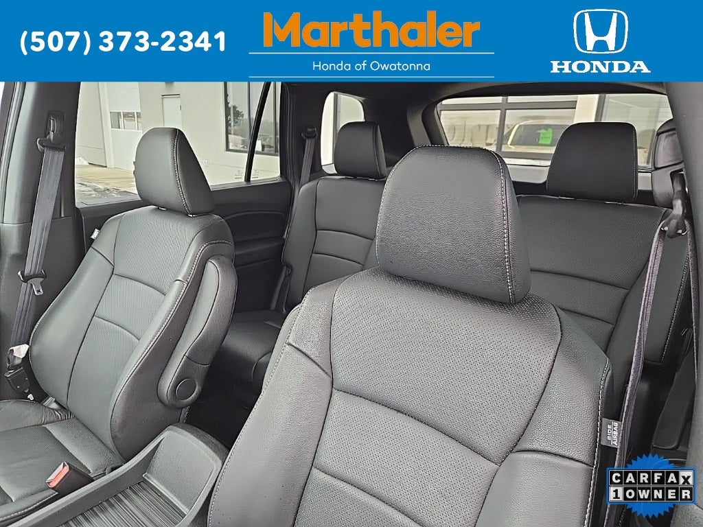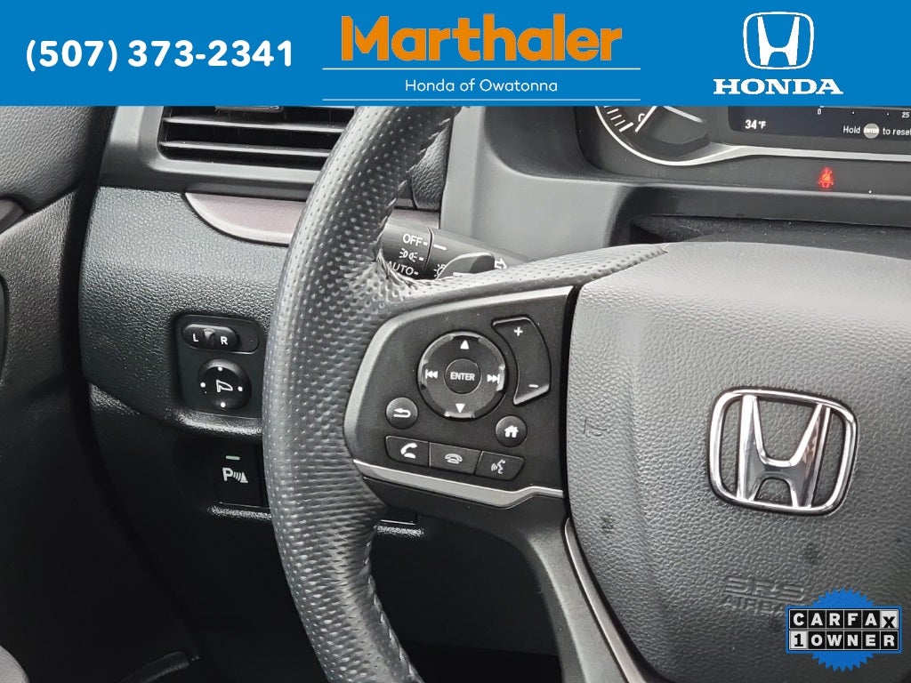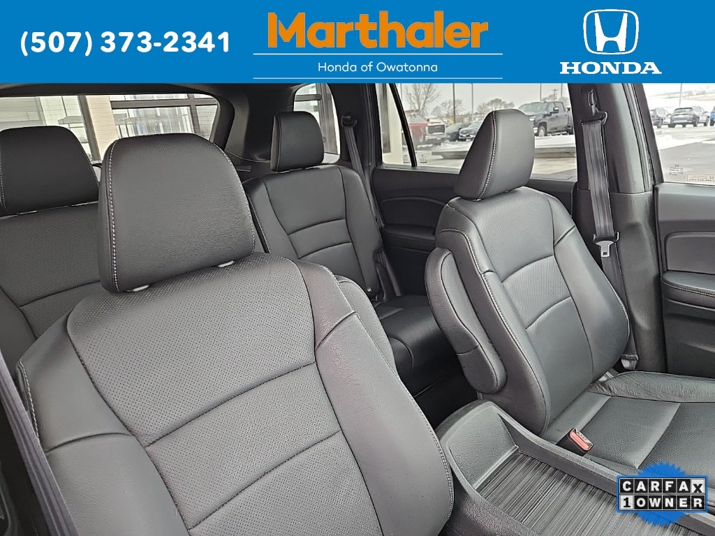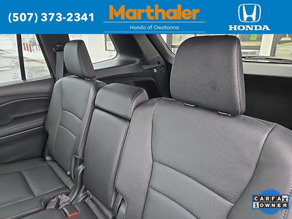 This vehicle Contains the following features and options: 4-Wheel Disc Brakes, 4.334 Axle Ratio, 7 Speakers, A/V remote: CabinControl, ABS brakes, Air Conditioning, Alloy wheels, AM/FM radio: SiriusXM, Apple CarPlay/Android Auto, Auto High-beam Headlights, Auto-dimming Rear-View mirror, Automatic temperature control, Blind Spot Information (BSI) System warning, Brake assist, Bumpers: body-color, Delay-off headlights, Driver door bin, Driver vanity mirror, Driver's Seat Mounted Armrest, Dual front impact airbags, Dual front side impact airbags, Electronic Stability Control, Emergency communication system: HondaLink Assist, Exterior Parking Camera Rear, Four wheel independent suspension, Front anti-roll bar, Front Bucket Seats, Front Center Armrest, Front dual zone A/C, Front reading lights, Fully automatic headlights, Garage door transmitter: HomeLink, Heated door mirrors, Heated Front Bucket Seats, Heated front seats, Illuminated entry, Lane departure: Lane Keeping Assist System (LKAS) active, Leather-Trimmed Seats, Low tire pressure warning, Occupant sensing airbag, Outside temperature display, Overhead airbag, Overhead console, Panic alarm, Passenger door bin, Passenger seat mounted armrest, Passenger vanity mirror, Power door mirrors, Power driver seat, Power Liftgate, Power moonroof, Power passenger seat, Power steering, Power windows, Radio data system, Radio: 215-Watt Audio System w/7 Speakers, Rear air conditioning, Rear anti-roll bar, Rear reading lights, Rear seat center armrest, Rear window defroster, Rear window wiper, Remote keyless entry, Security system, Speed control, Speed-sensing steering, Split folding rear seat, Spoiler, Steering wheel mounted audio controls, Tachometer, Telescoping steering wheel, Tilt steering wheel, Traction control, Trip computer, Turn signal indicator mirrors, Variably intermittent wipers, and Wheels: 20 Pewter Gray Alloy.