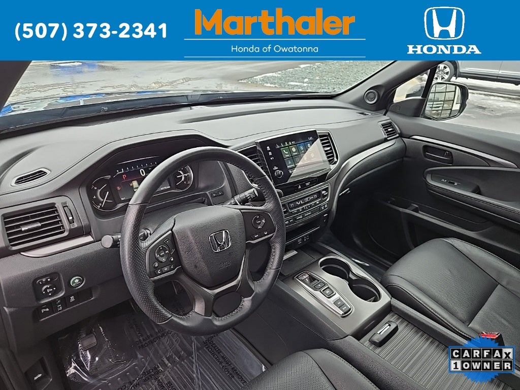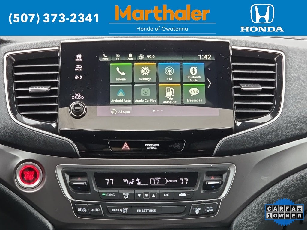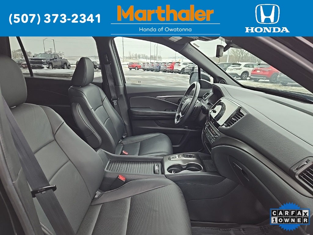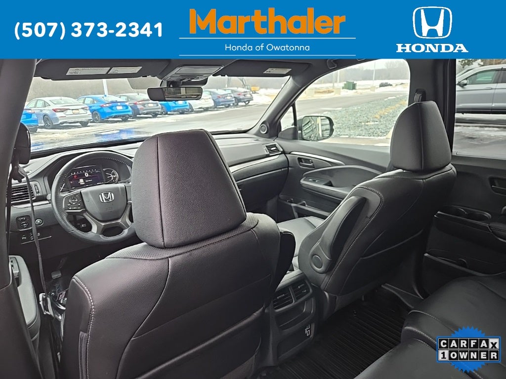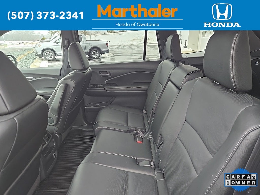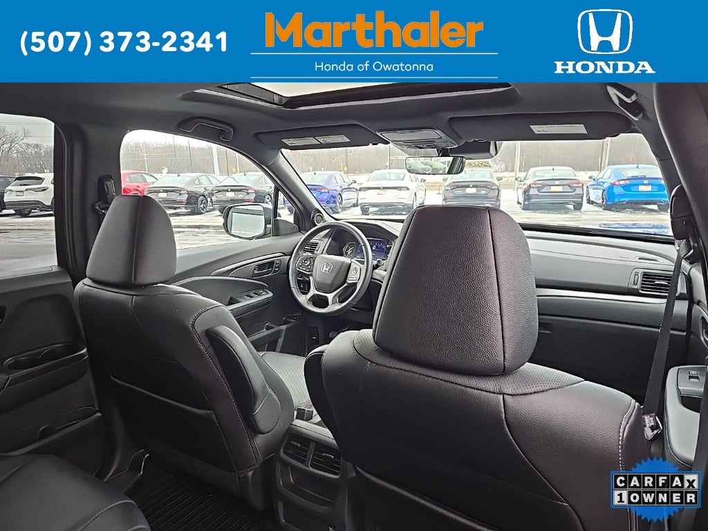 This vehicle Contains the following features and options: 4-Wheel Disc Brakes, 4.334 Axle Ratio, 7 Speakers, A/V remote: CabinControl, ABS brakes, Air Conditioning, Alloy wheels, AM/FM radio: SiriusXM, Apple CarPlay/Android Auto, Auto High-beam Headlights, Auto-dimming Rear-View mirror, Automatic temperature control, Blind Spot Information (BSI) System warning, Brake assist, Bumpers: body-color, Delay-off headlights, Driver door bin, Driver vanity mirror, Driver's Seat Mounted Armrest, Dual front impact airbags, Dual front side impact airbags, Electronic Stability Control, Emergency communication system: HondaLink Assist, Exterior Parking Camera Rear, Four wheel independent suspension, Front anti-roll bar, Front Bucket Seats, Front Center Armrest, Front dual zone A/C, Front reading lights, Fully automatic headlights, Garage door transmitter: HomeLink, Heated door mirrors, Heated Front Bucket Seats, Heated front seats, Illuminated entry, Lane departure: Lane Keeping Assist System (LKAS) active, Leather-Trimmed Seats, Low tire pressure warning, Occupant sensing airbag, Outside temperature display, Overhead airbag, Overhead console, Panic alarm, Passenger door bin, Passenger seat mounted armrest, Passenger vanity mirror, Power door mirrors, Power driver seat, Power Liftgate, Power moonroof, Power passenger seat, Power steering, Power windows, Radio data system, Radio: 215-Watt Audio System w/7 Speakers, Rear air conditioning, Rear anti-roll bar, Rear reading lights, Rear seat center armrest, Rear window defroster, Rear window wiper, Remote keyless entry, Security system, Speed control, Speed-sensing steering, Split folding rear seat, Spoiler, Steering wheel mounted audio controls, Tachometer, Telescoping steering wheel, Tilt steering wheel, Traction control, Trip computer, Turn signal indicator mirrors, Variably intermittent wipers, and Wheels: 20 Pewter Gray Alloy.